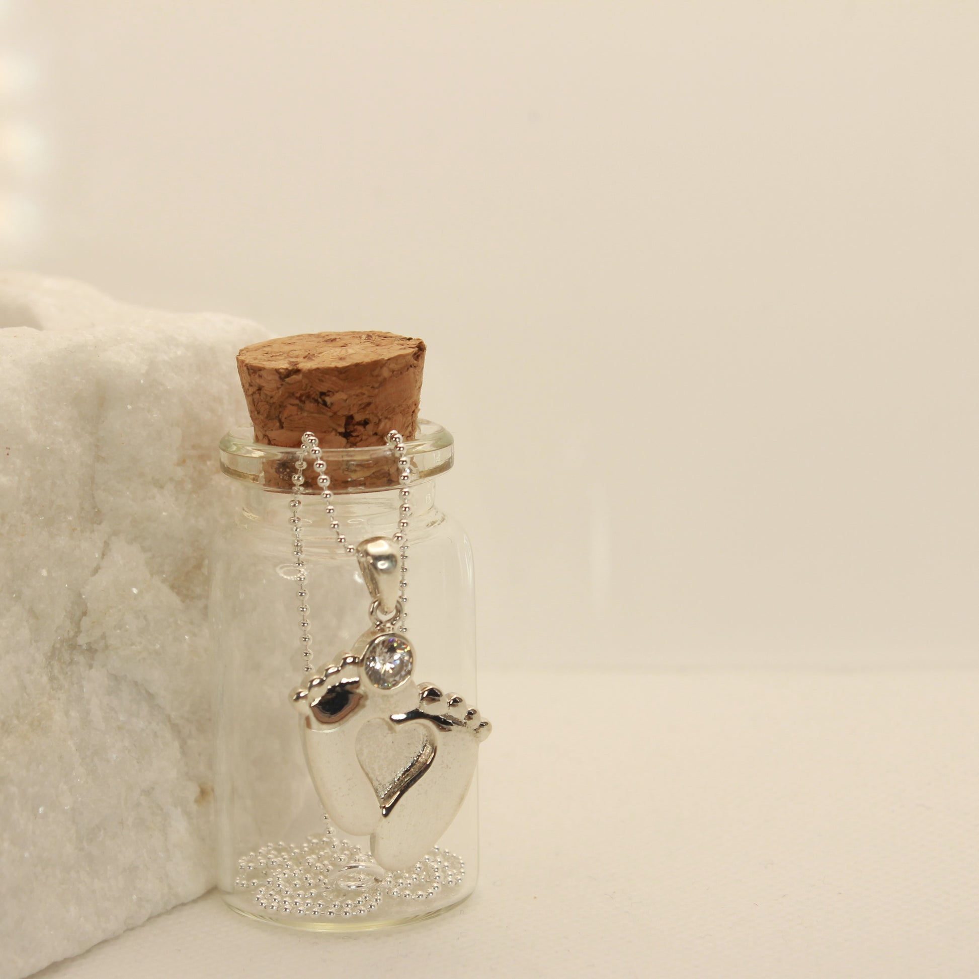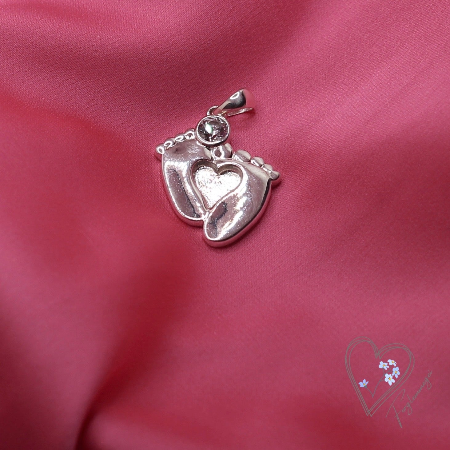 2 små barneføtter av sølv med ett hjerte i midten som kan fylles med ditt innhold. Øverst på anhenget er det en nydelig skinnende zirkonstein