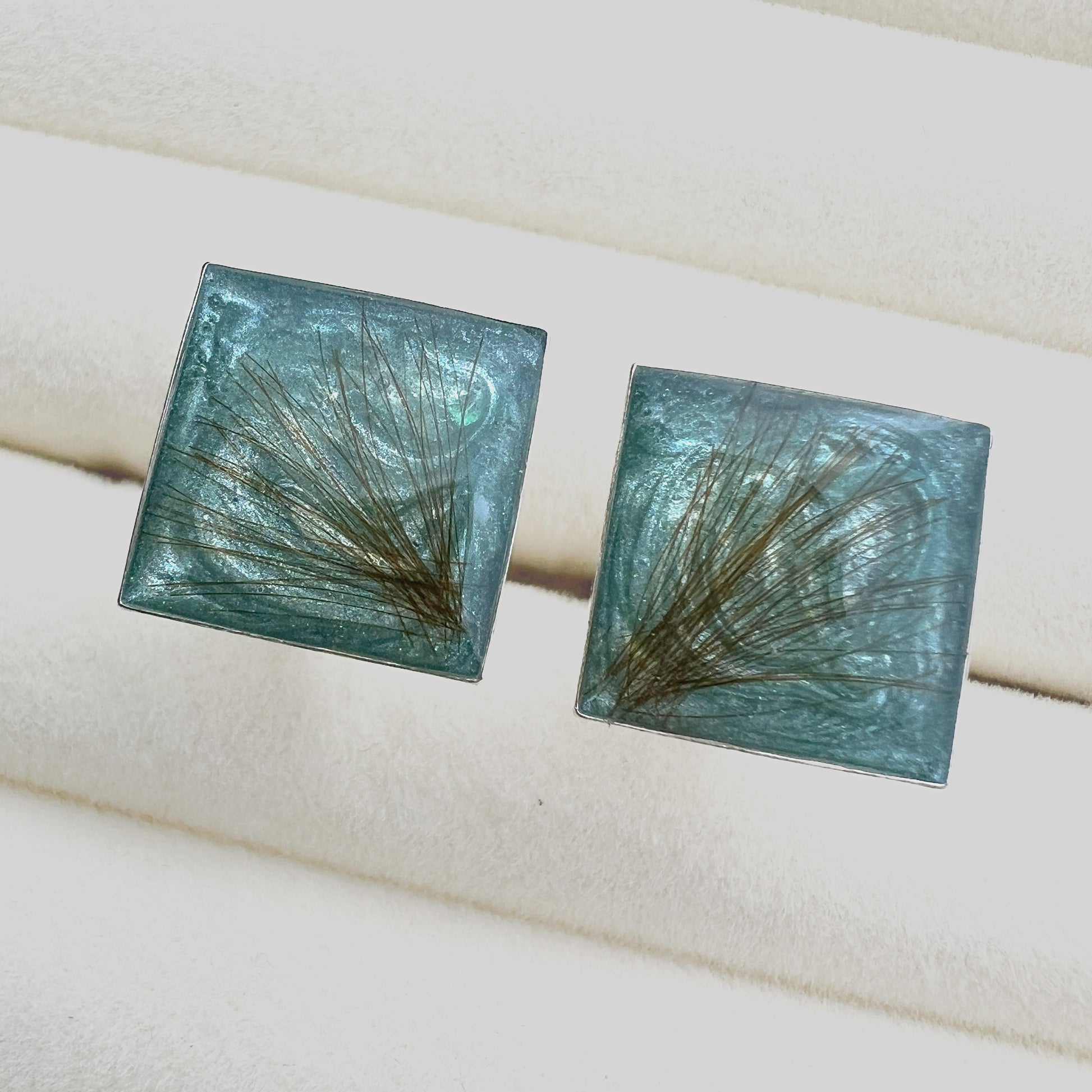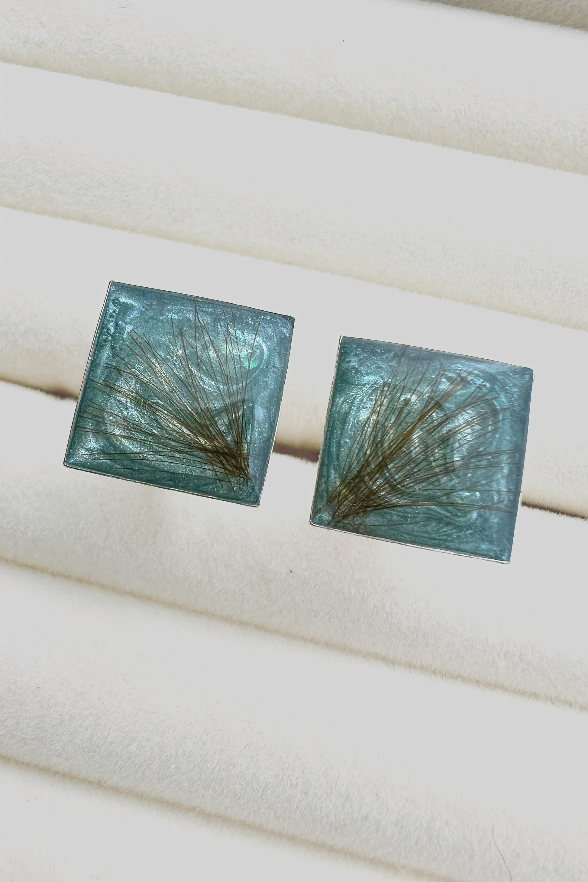 Disse firkantede mansjettknappene er laget i sterling sølv og måler 14,5 mm. Designet er stilrent og passer både til formelle og personlige anledninger. Hver knapp lages på bestilling og kan fylles med ønsket materiale, som aske, hår, pels, tørkede blomster, morsmelk eller tekstil. Et diskret minnesmykke med varig verdi.