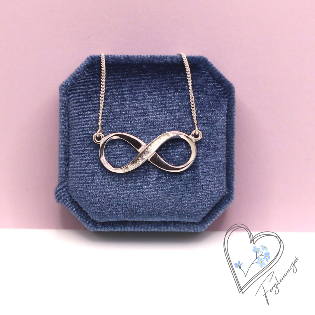 Ett vakkert smykke med evighetssymbolet laget i 925 sterling sølv. Lengde på smykket med kjede er ca 45 cm.