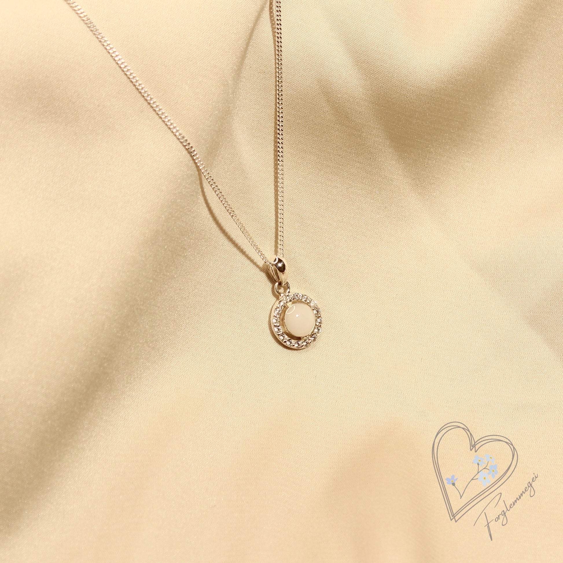 Ett nydelig fint rundt smykke med zirkonsteiner rundt, smykket kan fylles med din egen morsmelk eller annet personlig innhold.