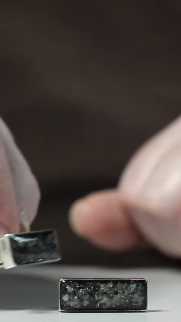 Disse rektangulære mansjettknappene er laget i sterling sølv og måler 22x7 mm. Designet er stilrent og passer både til formelle og personlige anledninger. Hver knapp lages på bestilling og kan fylles med ønsket materiale, som aske, hår, pels, tørkede blomster, morsmelk eller tekstil. Et diskret minnesmykke med varig verdi.
